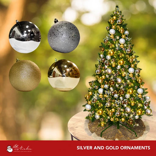 9FT Artificial Christmas Tree PVC Pre-Decorated Silver and Gold with Warm White Lights